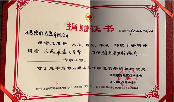 2022年,江苏海能电器有限公司获得了东台市工商联(总商会)颁发的《爱心企业》奖牌。铜川市耀州区红十字会颁发的捐赠证书,感谢江苏海能电器有限公司发扬“人道、博爱、奉献”的红十字精神,捐赠人民币二万元,支持耀州区乡村振兴建设。
