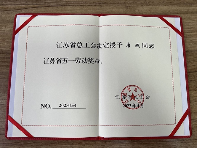 在2023年“五.一”节前夕,江苏海能电器有限公司职工唐斌,受到了江苏省总工会颁发的江苏省“五.一劳动奖章”。这是唐斌个人获得的最高荣誉,也是江苏海能电器有限公司职工获得的最高荣誉。
